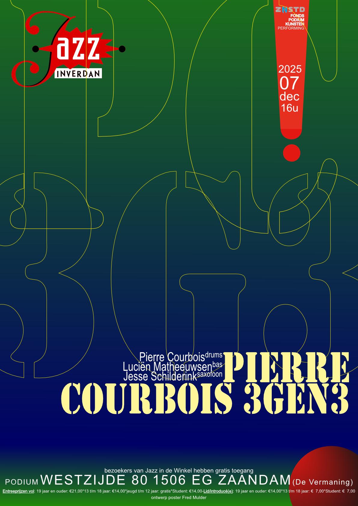 Er zijn weinig andere Nederlandse drummers die de vellen van hun drumstel zo mooi kunnen laten zingen als Pierre Courbois. Ook zijn partners in crime van het trio 3GEN3 brengen een grote zangerigheid in hun spel mee. De naam van de groep slaat op de drie generaties die erin aan het woord zijn. Want naast Courbois (1940) zelf horen we bassist Lucien Matheuwsen (1964) en saxofonist Jesse Schilderink (1995). De groep is het levende bewijs dat leeftijd ook maar een kwestie van een getal is. Alle drie spelen ze namelijk met even veel overtuiging en zeggingskracht. Het gehele repertoire werd bij elkaar geschreven door Courbois zelf, en bestrijkt een breed spectrum. Hij leeft zich graag uit in oneven maatsoorten (zoals 5/4, 7/8 of 11/8), maar schrijft net zo makkelijk een overtuigende ballad, een springerig thema of een soepel stukje swing. 3GEN3 is de laatste loot aan de boom van eigen bands die de drummer al zijn hele muzikale leven (sinds midden jaren 50!) leidt. Wie hem kent, zal dit sublieme trio zeker willen horen, en wie hem nog niet kent, moet dat zeker ook komen doen.